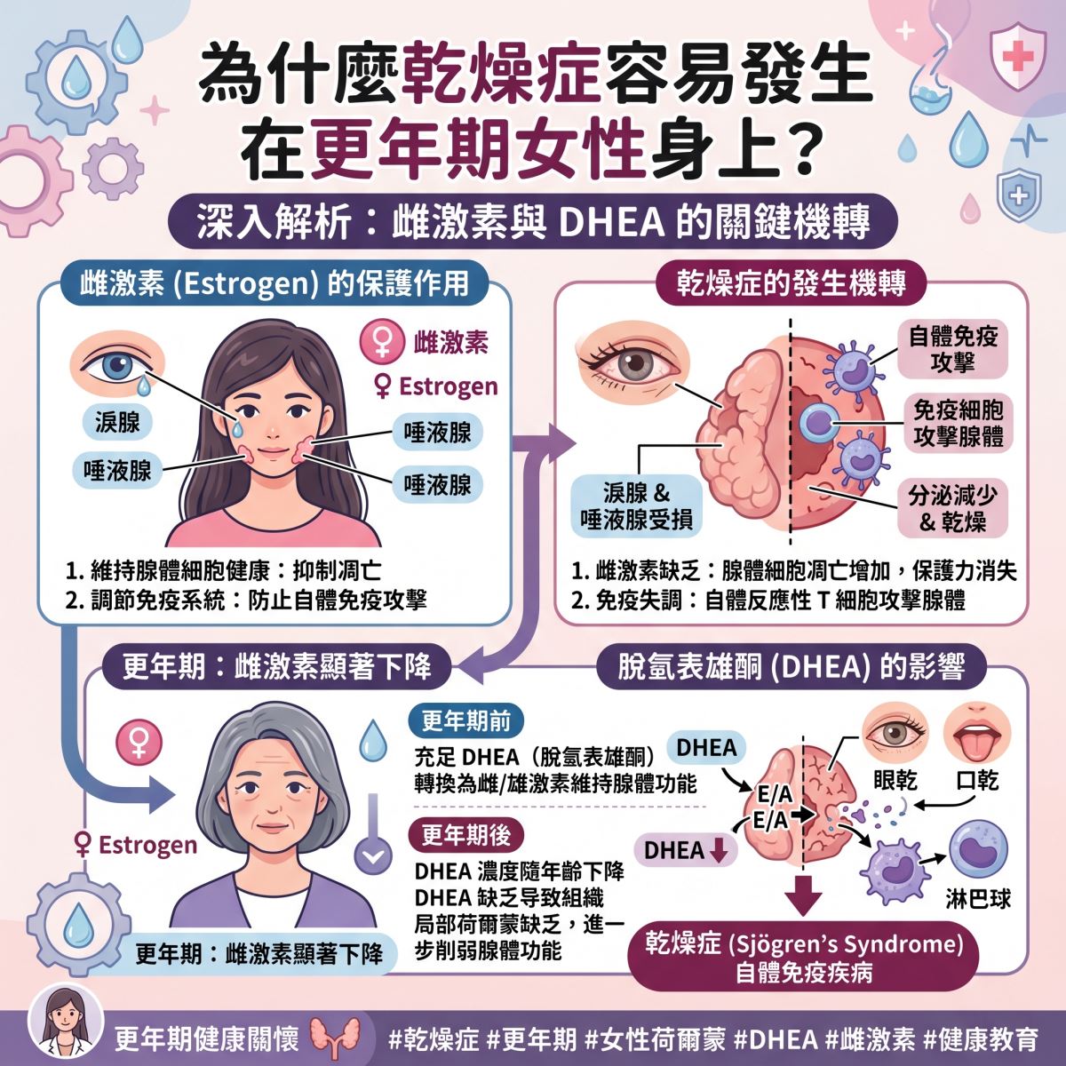更年期女性之所以成為乾燥症的最大標的,主要是因為體內「雌激素 (Estrogen)」的斷崖式下降,以及「雄性激素 (Androgens,主要是 DHEA)」的老化性減少,這兩者共同引發了免疫系統與腺體的連鎖崩潰反應。